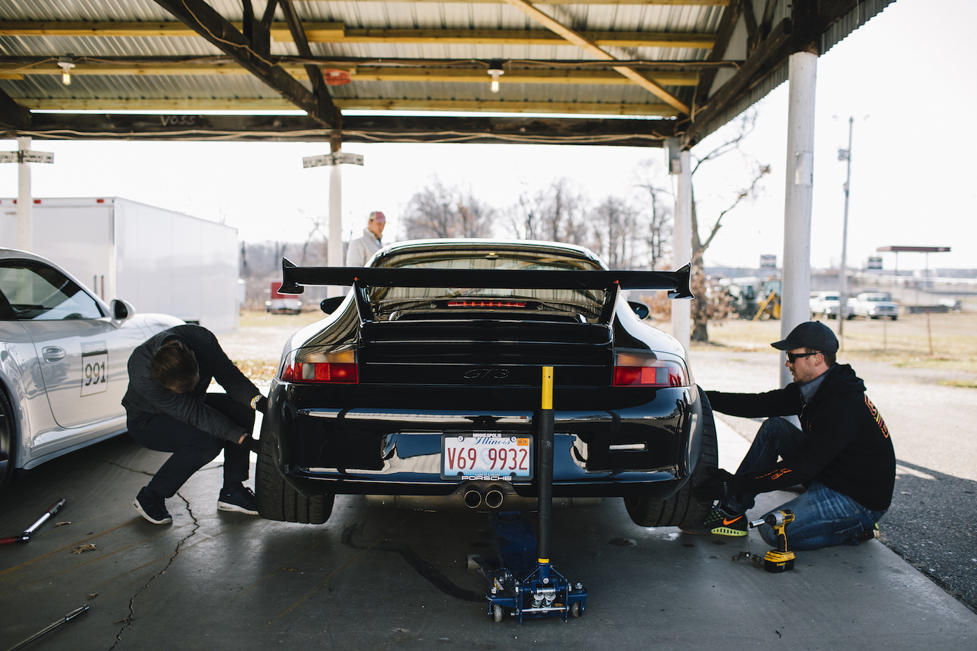A 991 GT3 fits beneath the 10×20 aluminum frame nicely, with plenty of room up front and behind for activities. EZup did a great job with the build.